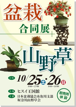 「盆栽・山野草合同展」が、10月25日(土)、26日(日)の2日間に渡り、ヒスイ王国館にて開催されます。