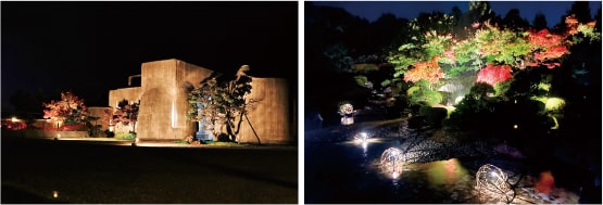 紅葉の見ごろを迎え、ライトアップされた夜の美術館と庭園、竹灯籠の幻想的で美しい灯りをお楽しみください。