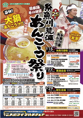 冬の味覚の王様、日本海のあんこうが気軽に味わえる「糸魚川荒波あんこう祭り」が3会場で開催されます。大鍋あんこう汁販売や豪快な「あんこうつるし切り実演」をはじめ、楽しいイベントも行われます。