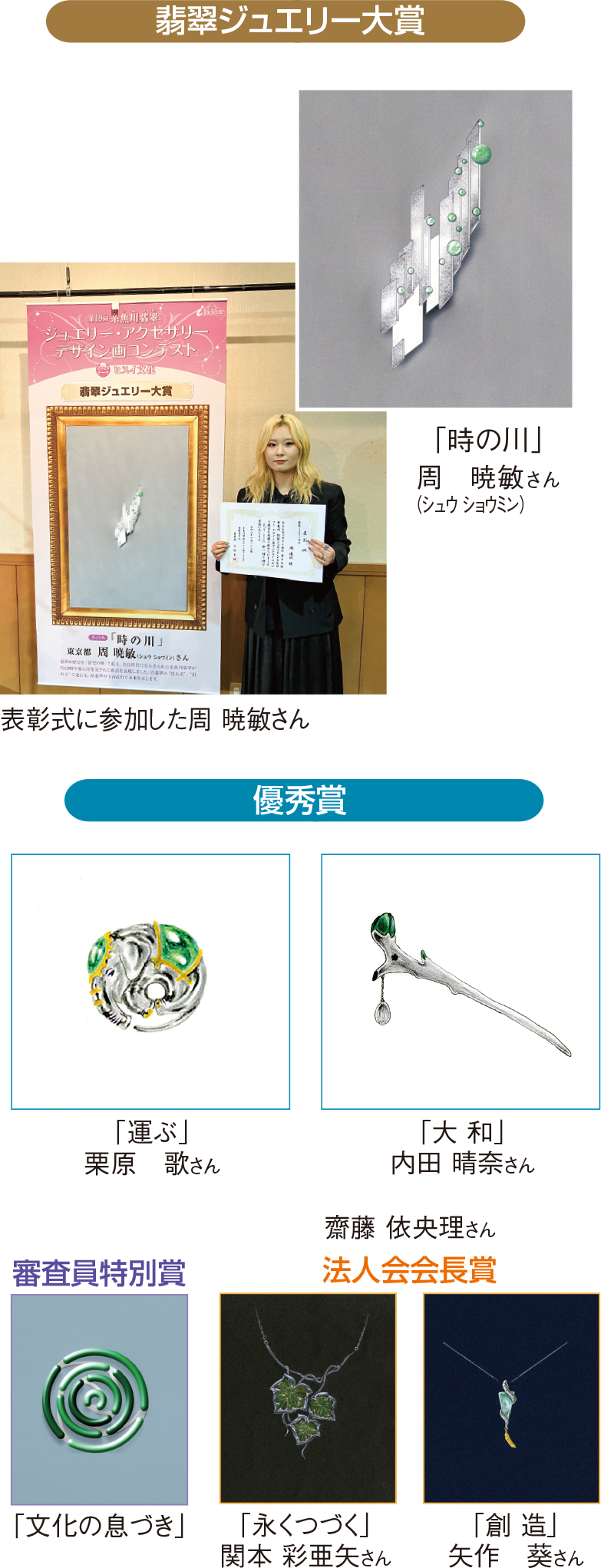 作品のテーマは「ヒスイ文化」。194人266点もの力作が寄せられました。審査は昨年12月に東京都内で専門家を交えて行われ、6作品の入賞が決定しました。翡翠ジュエリー大賞は周 暁敏(シュウ ショウミン)さんの作品「時の川」が受賞。翡翠の歴史を「歴史の川」に見立て、奈良時代に忘れ去られた糸魚川翡翠が約1200年後に再発見される物語を、過去と未来をつなぐ時の流れとして表現した作品です。