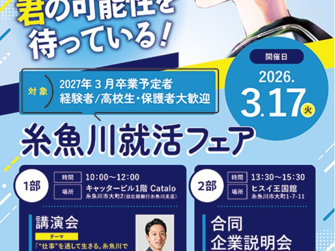 今年の「糸魚川就活フェア」は、1部に講演会とパネルディスカッション、2部に合同企業説明会を行います。それぞれ1部・2部のみの参加も可能です。1部は一般の方もご参加いただけます。詳細はホームページをご確認ください。