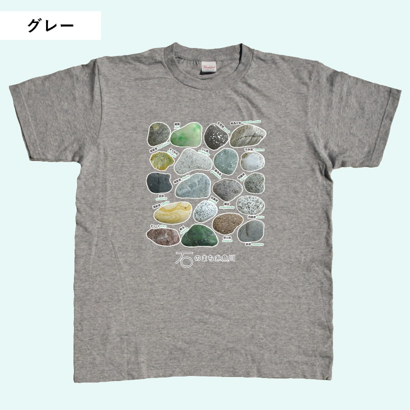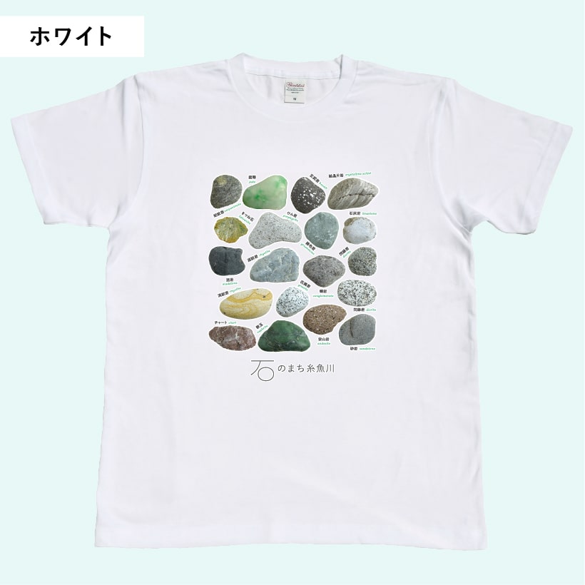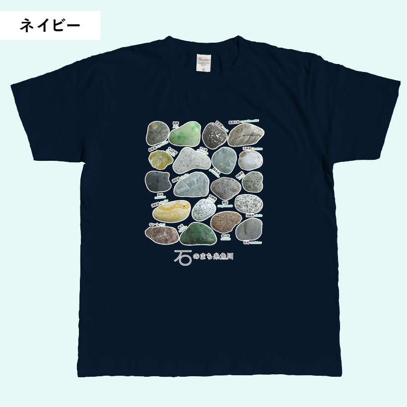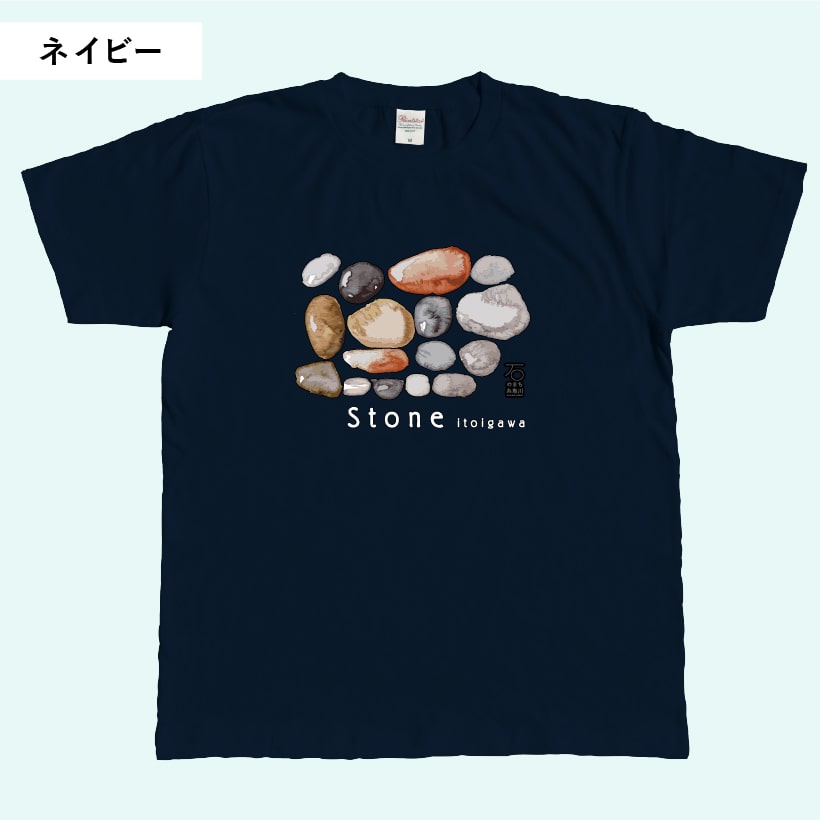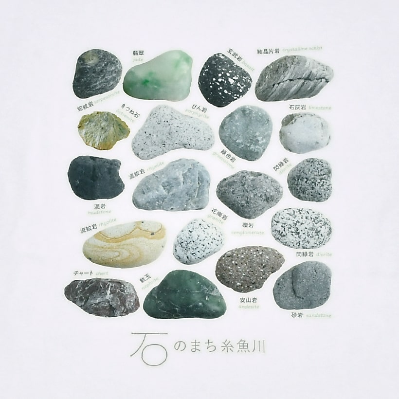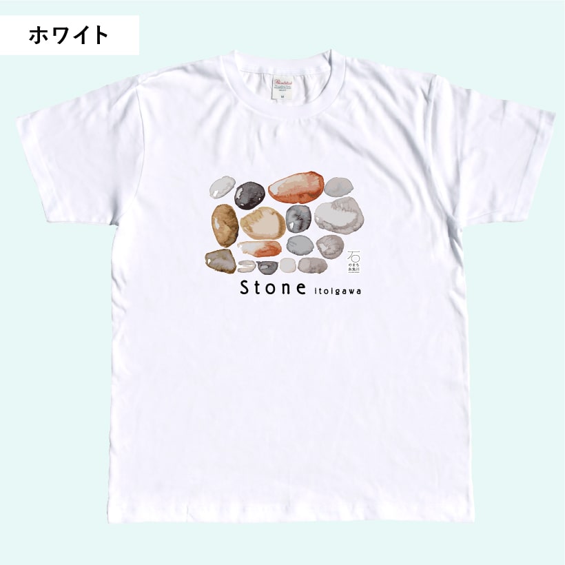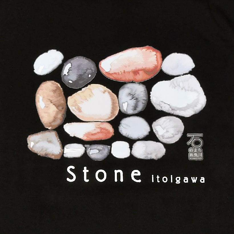 見つけた石はどれも大切な宝物。糸魚川で採れる石たちをそっとTシャツに閉じ込めました。エレガントに石を着こなしたいあなたにはコレ!