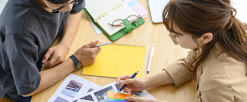 ヒアリングした内容をもとに、デザイナーと営業担当で、最適なデザインを「かたち」にしていきます。それぞれ得意分野がある個性的なデザイナーたちが、デザイン面でお客様に貢献できるよう尽力します。