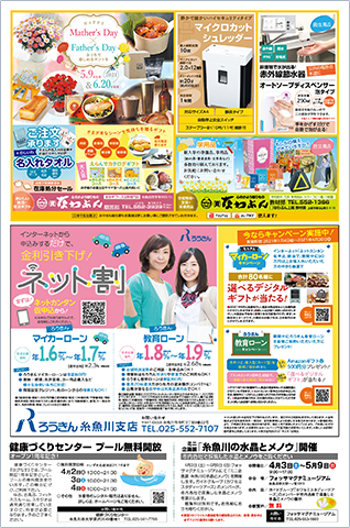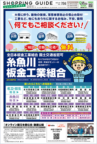 ショッピングガイドは毎月1~2回発行している糸魚川地域の合同広告紙です。デザイン・印刷・折込料金がセットになったわかりやすい料金で、地域の情報紙として長年親しまれています。単独の折込チラシより安価なことが最大のメリットですが、クオリティは単独チラシと変わらない、地域一番のデザインで、一つひとつの広告を仕上げています。